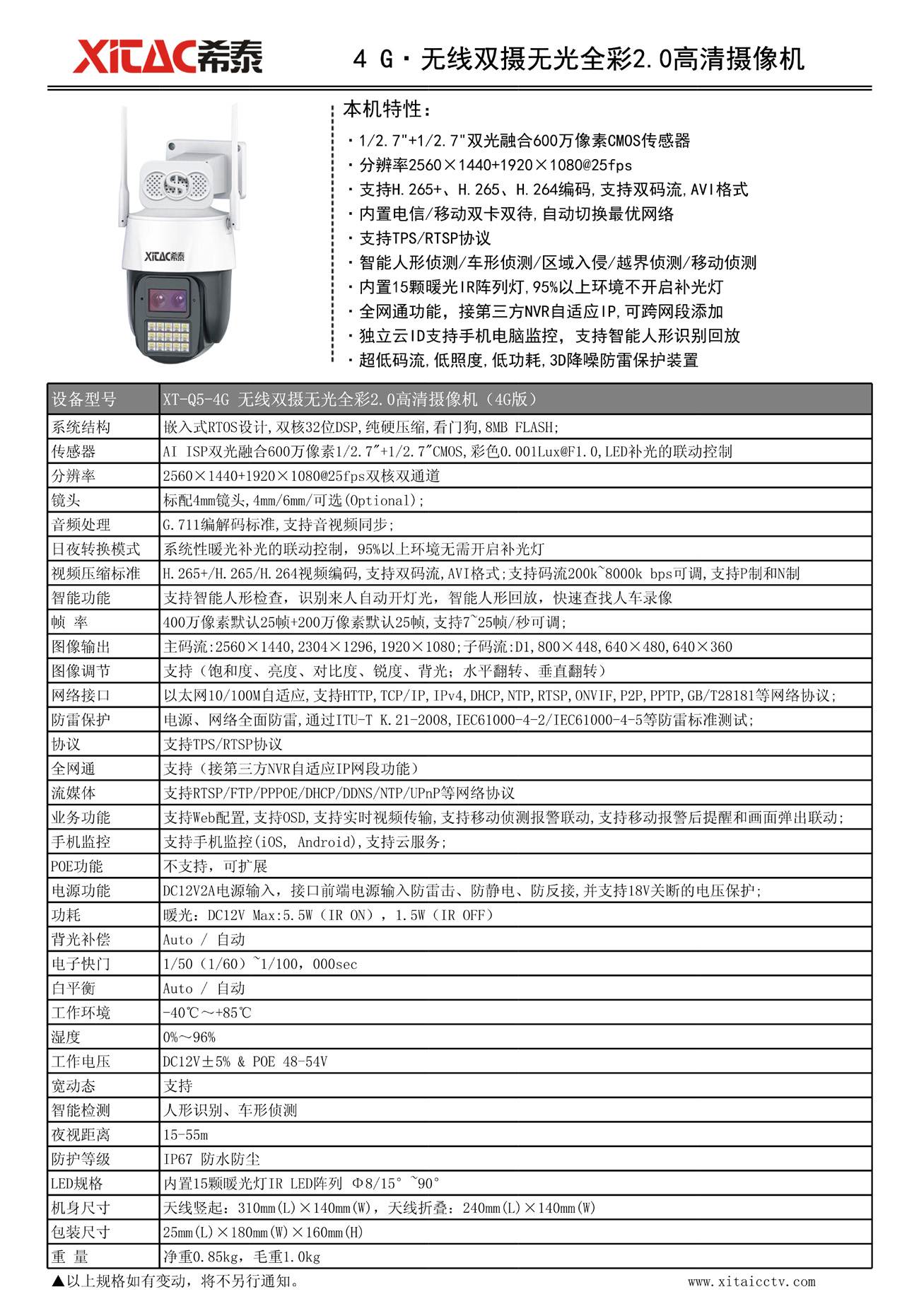 H.265+600万像素,内置电信/移动4G双卡双待,自动切换最优网络,嵌入式RTOS设计,内置双核DDR纯硬压缩,看门狗。DC12V供电,无越影无光全彩2.0,AI ISP双光融合技术,95%以上环境无需开启补光灯。人形识别,车形侦测,全网通功能,支持跨网添加,自适应网关。AI智能自动区分人、车、无人录像视频,从而快速精准查找录像,支持RTSP协议。