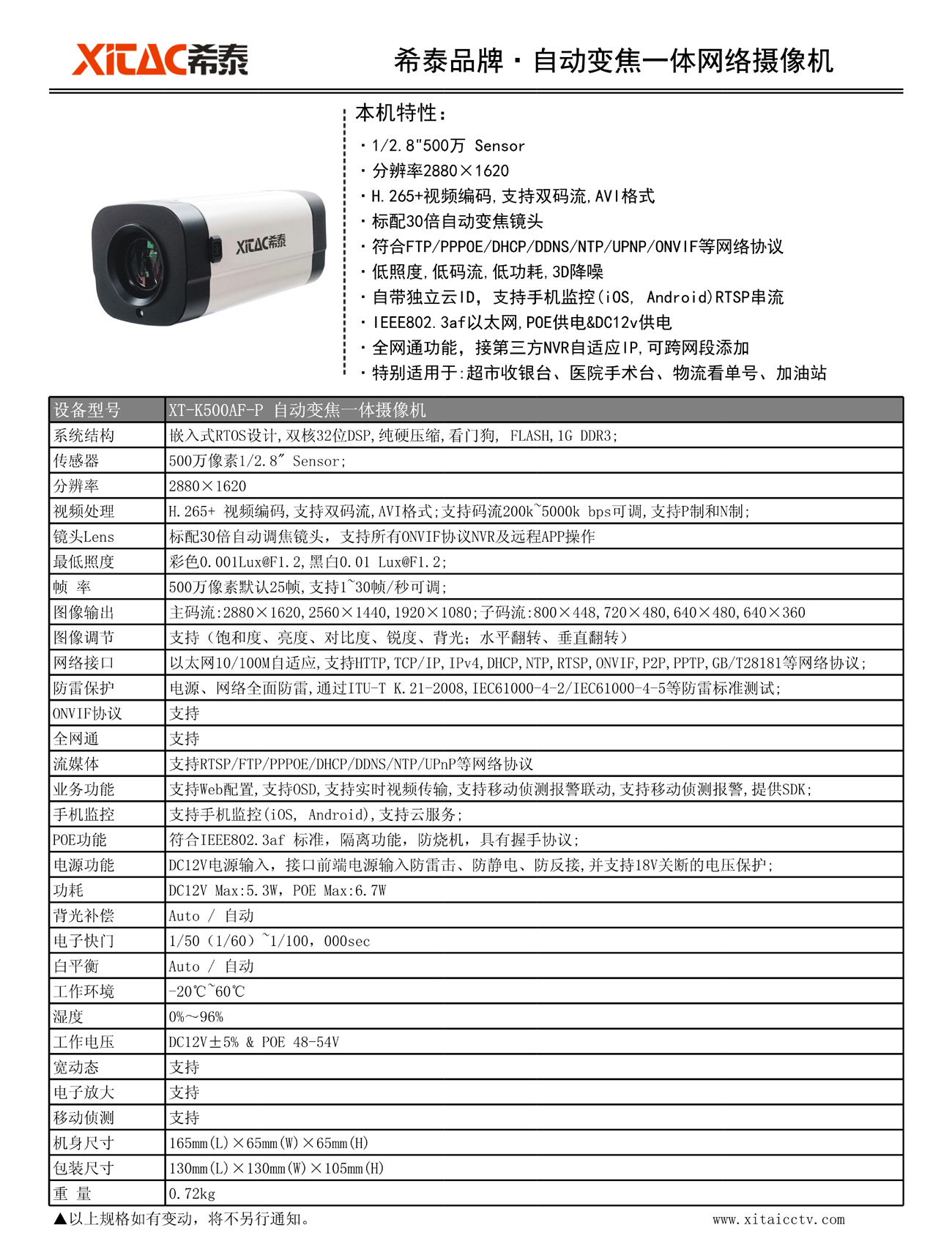 XT-K500AF-P 500万POE自动变焦一体网络摄像机