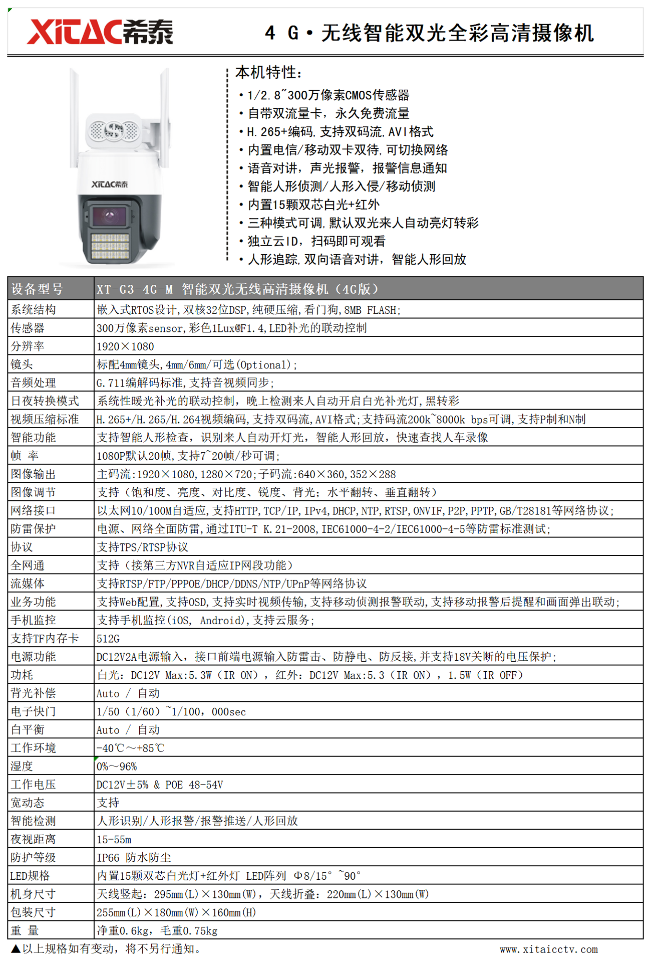 XT-G3-4G-M 300万智能双光高清网络摄像机