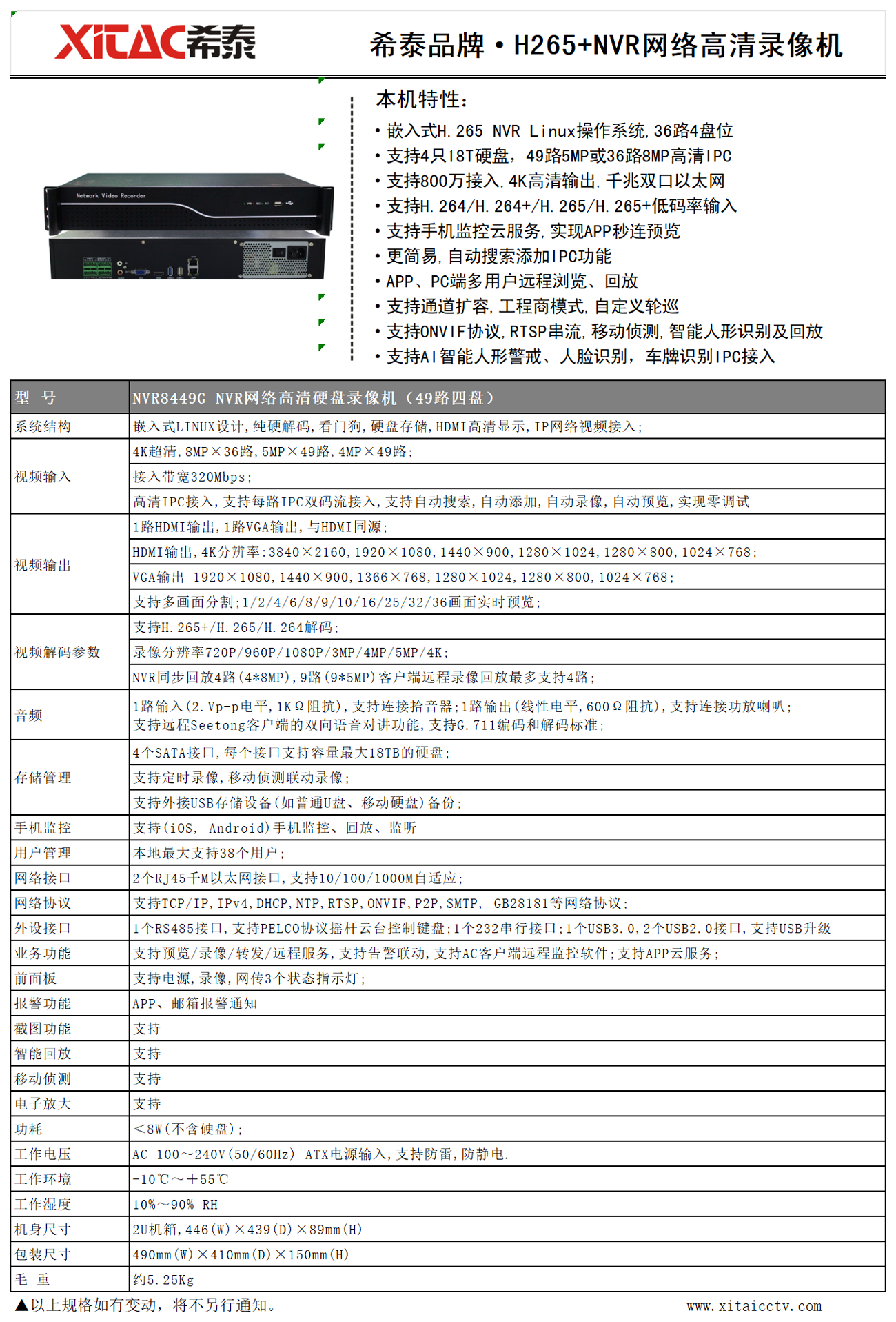 XT-NVR8449G 49路H265+NVR网络高清硬盘录像机